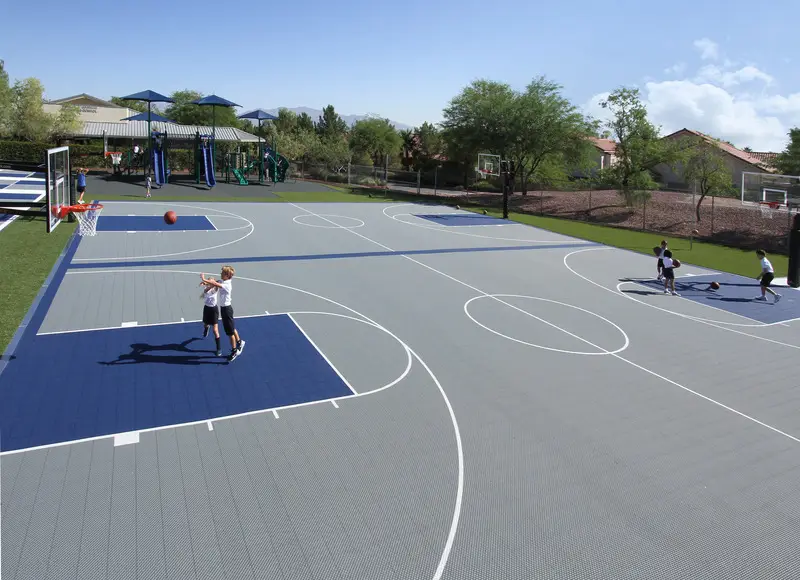Our commercial outdoor basketball courts deliver consistent performance and unmatched durability throughout the seasons. Our specially-engineered, open grid tile design drains and dries quickly and provides improved grip and traction needed for competitive play. We offer a variety of court tile options that are completely customizable to best fit your athletic requirements.